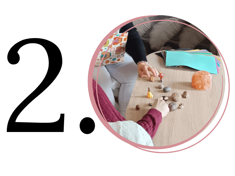 A folyamat egyszerű és személyre szabott. Rövid beszélgetéssel indul, ahol kijelöljük, mivel szeretnél dolgozni, majd tárgyak és lapok segítségével megjelenítjük a rendszer fontos szereplőit. Ez lehetővé teszi, hogy tisztábban érzékeld azokat a dinamikákat, amelyek hatással vannak rád. Nem a múlt részletes elemzése a cél, hanem annak felismerése, hogy jelenleg hol van az elakadás és hogyan lehet erre rálátni.